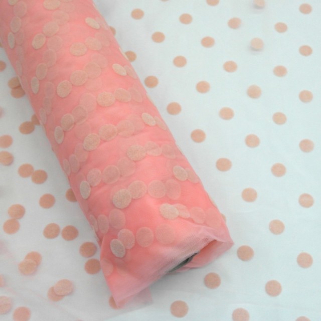 - Мягкий фатин нежно кораллового цвета с горошками для пошива нарядных юбочек
