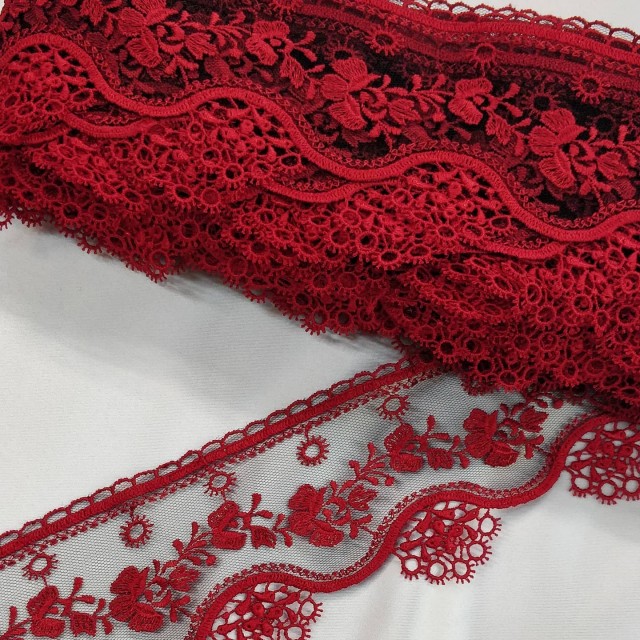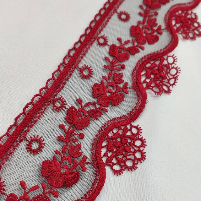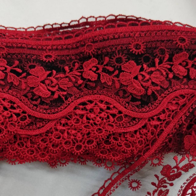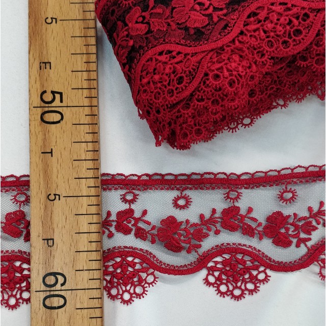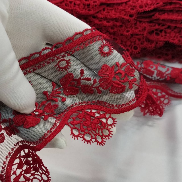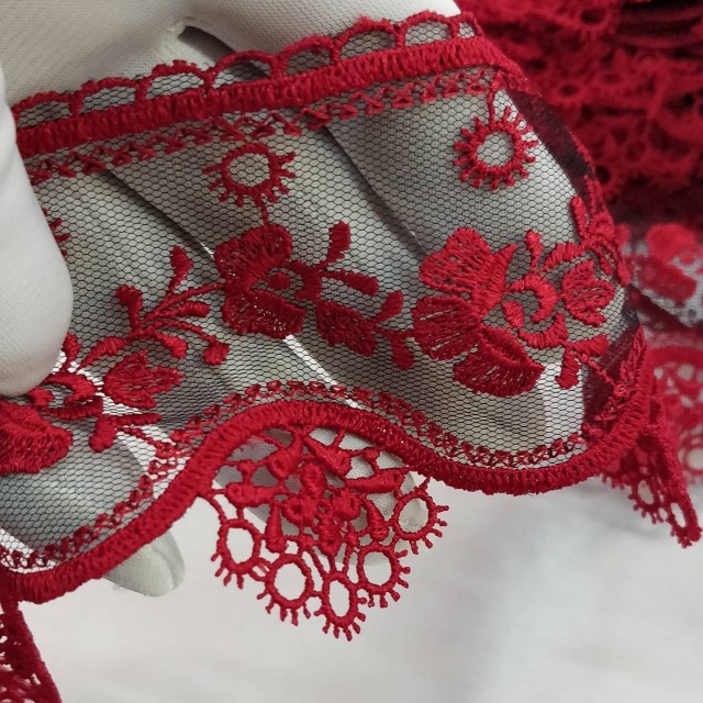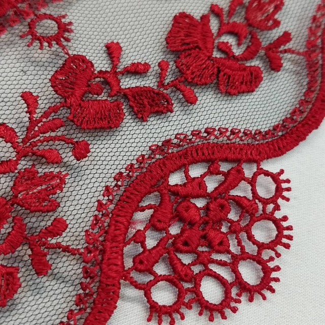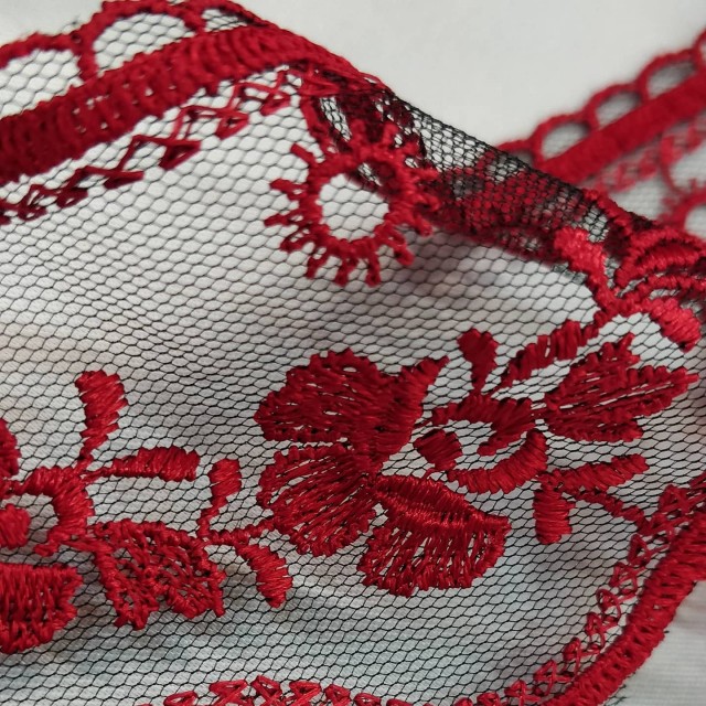 • Кружево выполнено на тонкой сетке черного цвета с элементами макраме (узор) по краю который красного цвета.