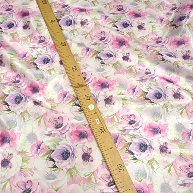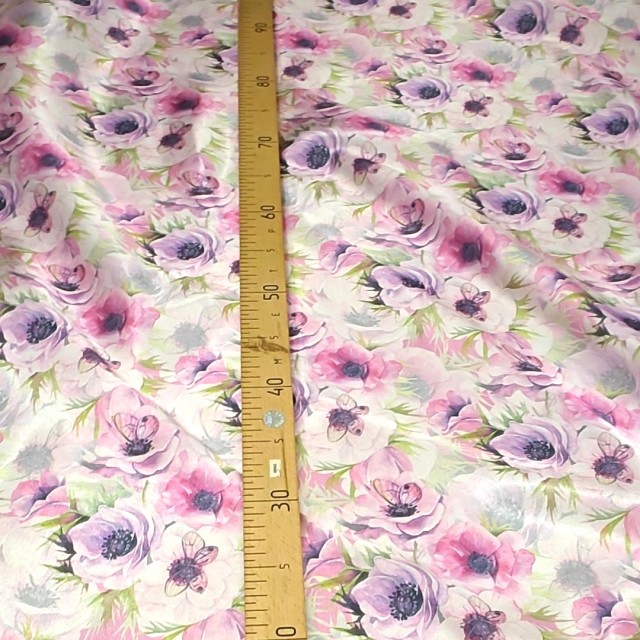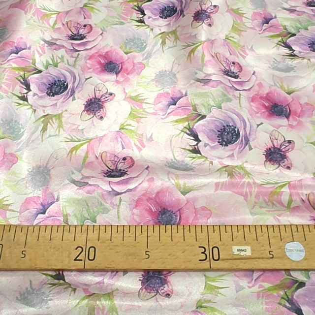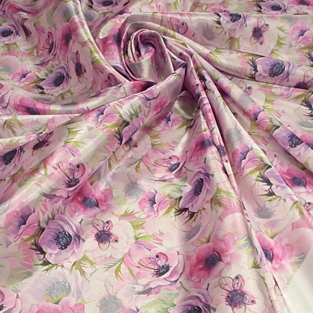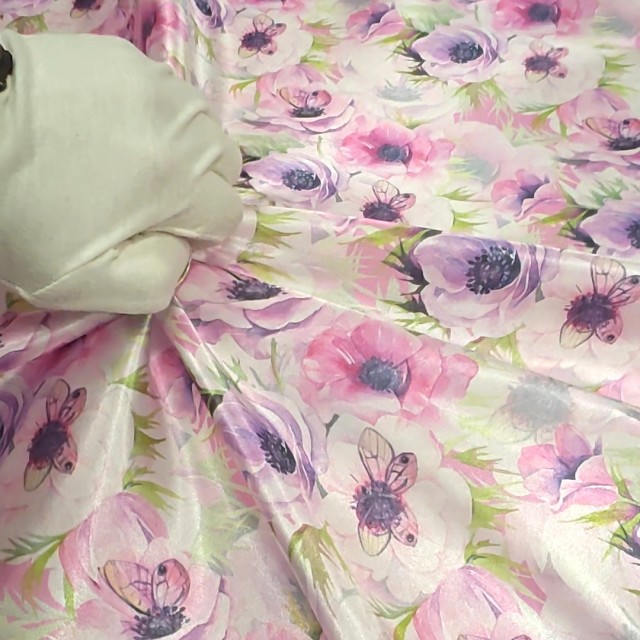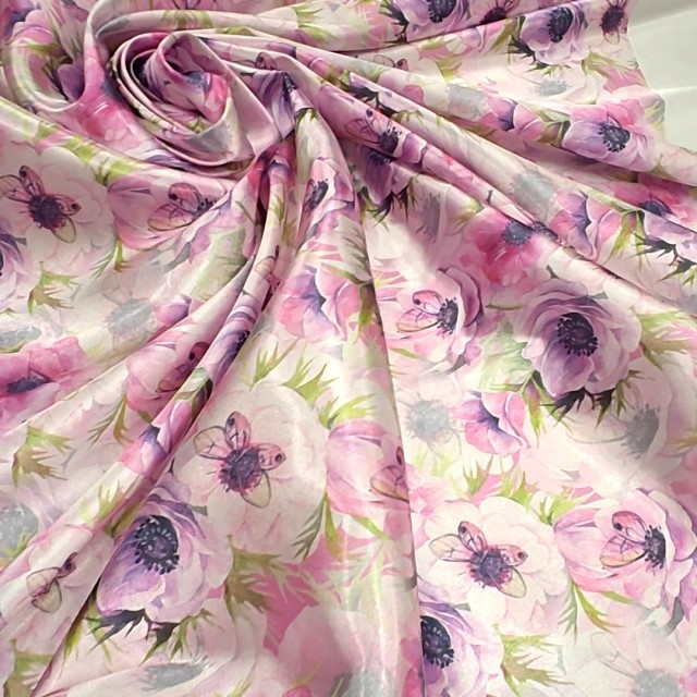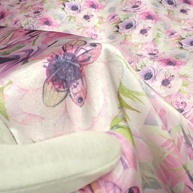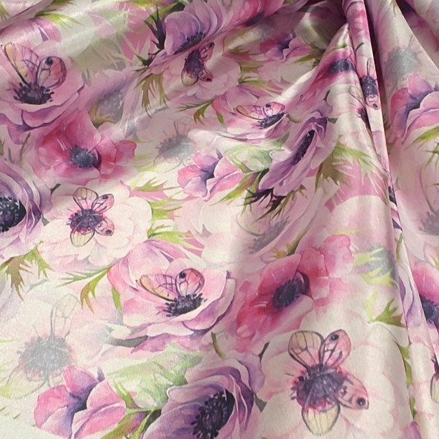 - Атлас с блеском Кристалл с принтом бабочки на анемонах для пошива нарядных платьев