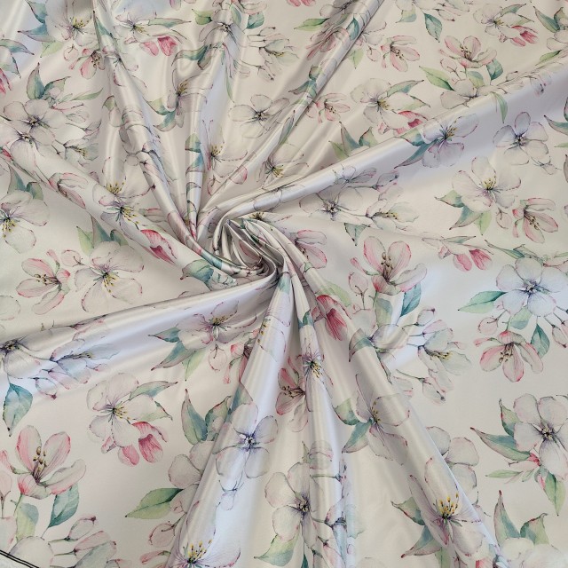 Атлас Дюпон с принтом цветочки яблони