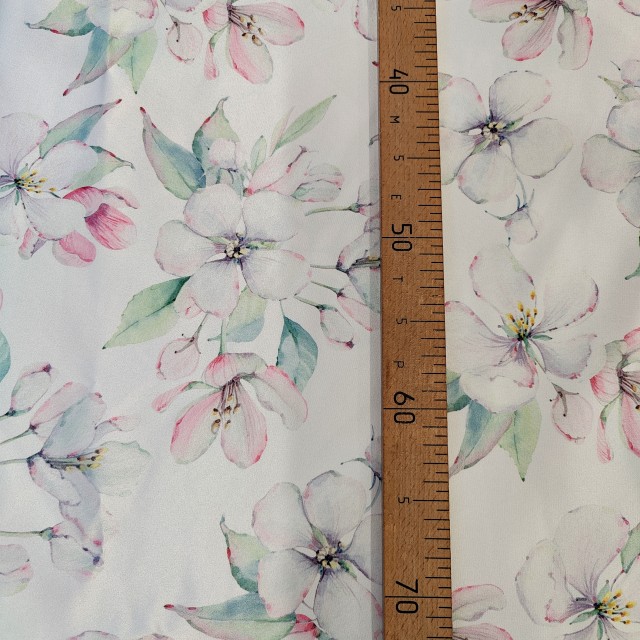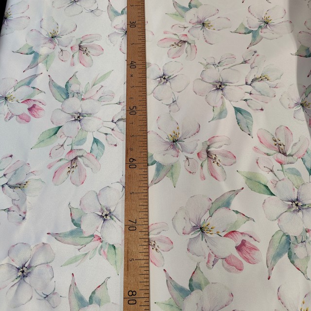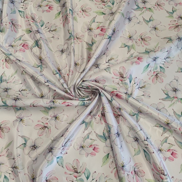 - Атлас Дюпон с принтом цветочки яблони