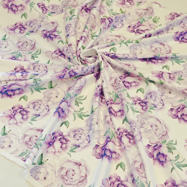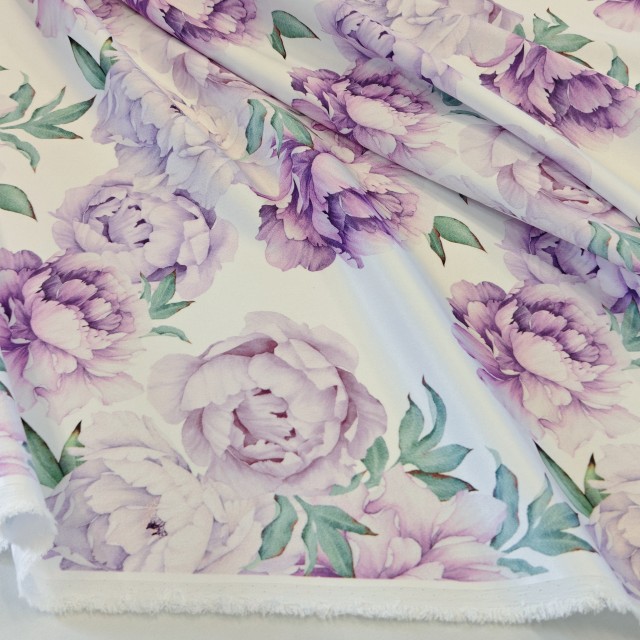 - Плотный стрейч атлас Amerikan saten likra с пионами для пошива нарядных платьев