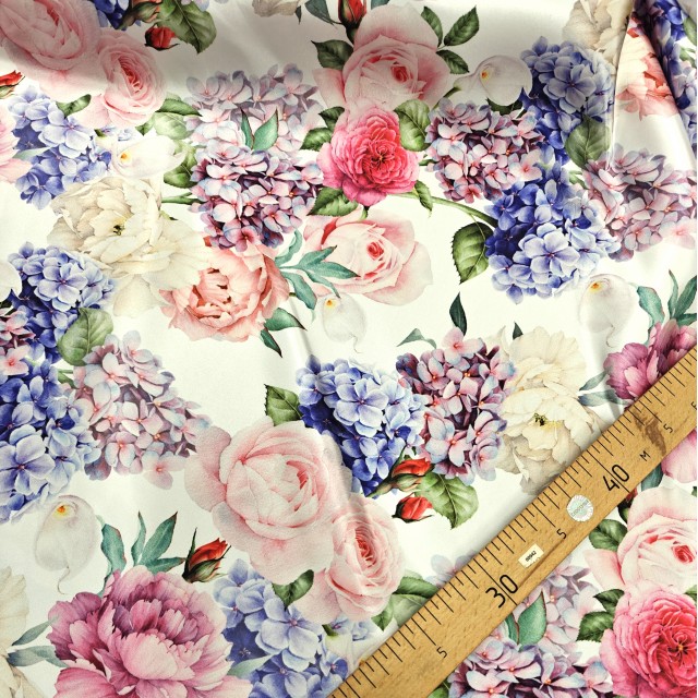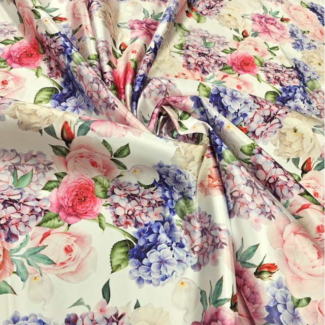 - Атлас Дюпон с красивым цветочным принтом для шитья нарядных платьев.