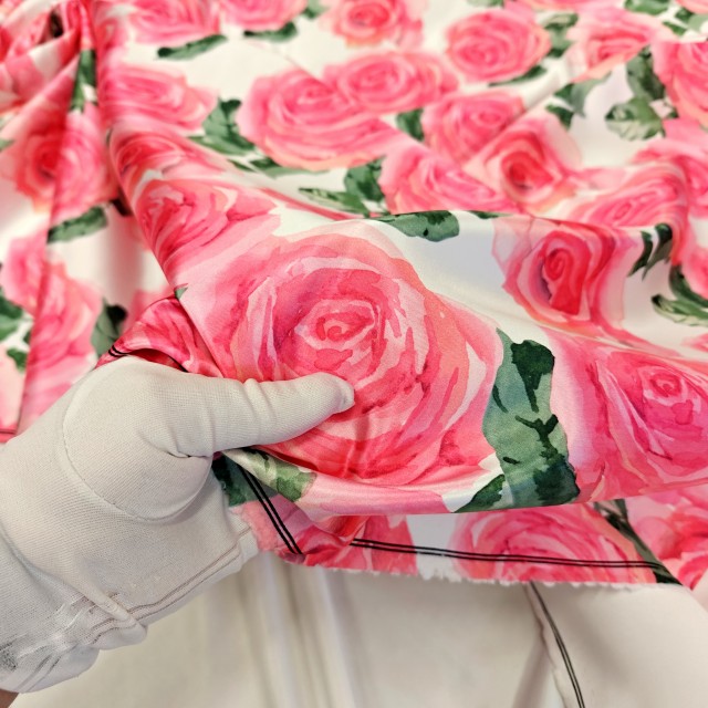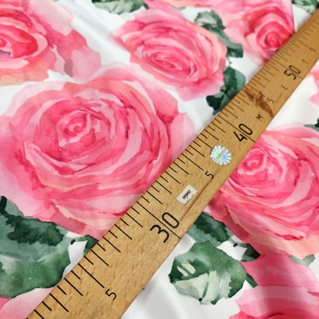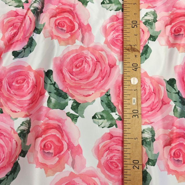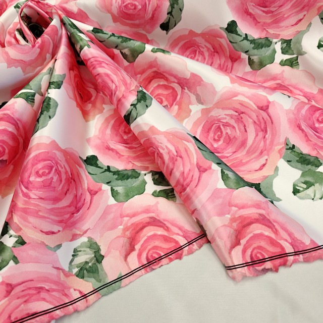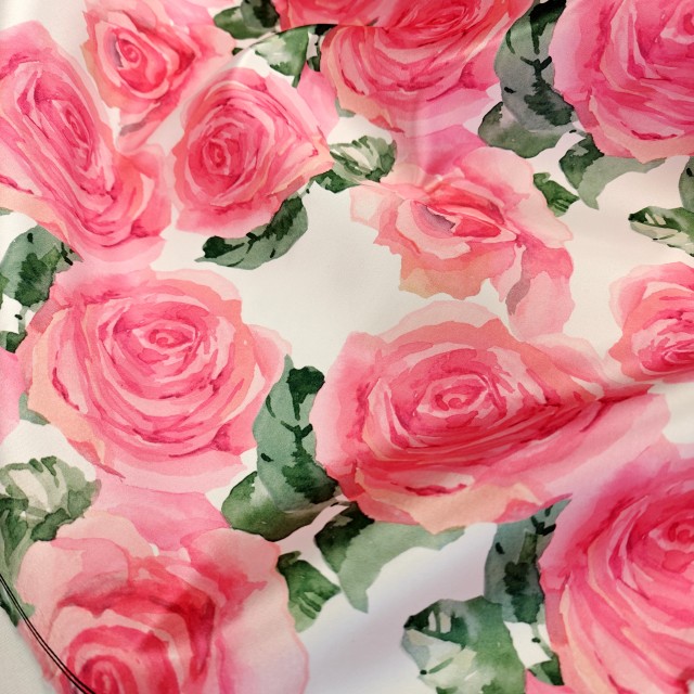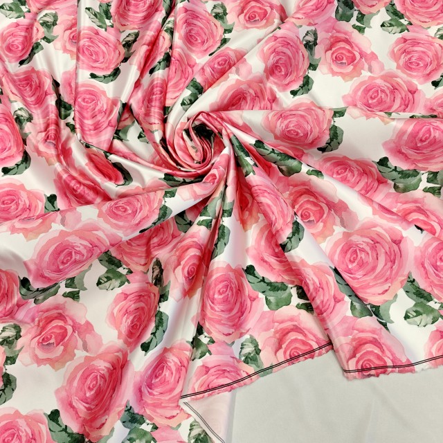- Атлас Дюпон с цветочным принтом - Розы акварелью для пошива нарядных вечерних платьев.
