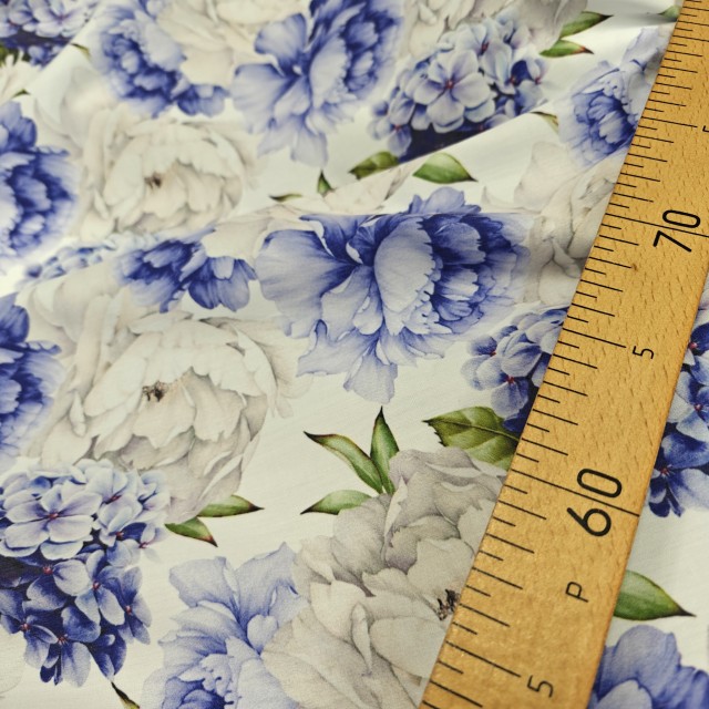 - Плательный поплин с бело голубыми пионами для пошива модных платьев