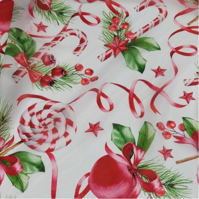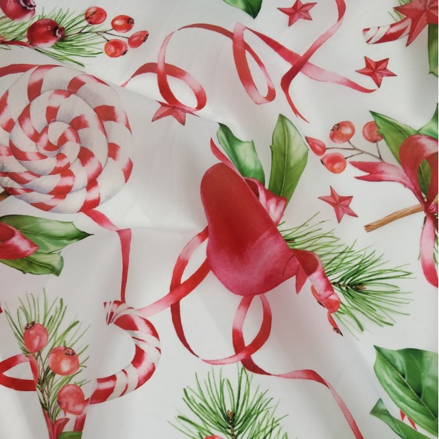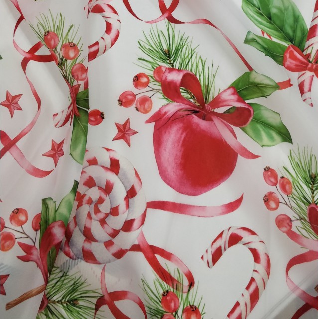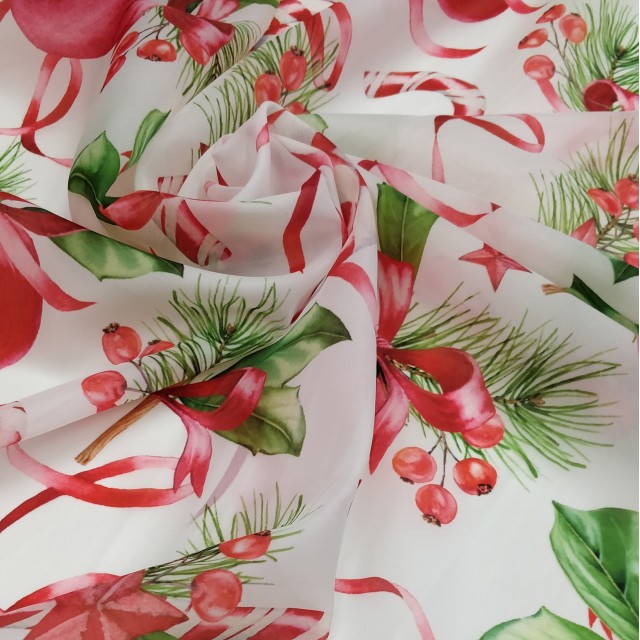 Ткань органза матовая Виола с ярким новогодним принтом будет прекрасным вариантом для пошива нарядного платья.