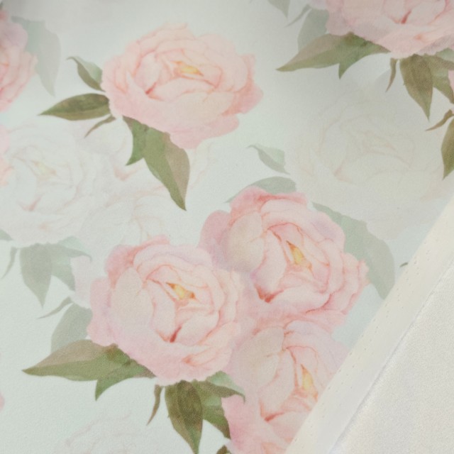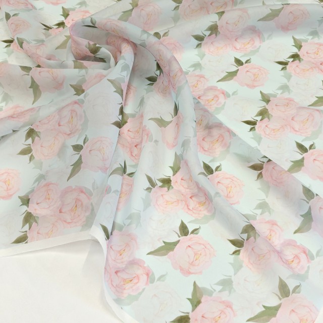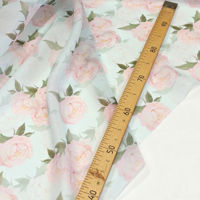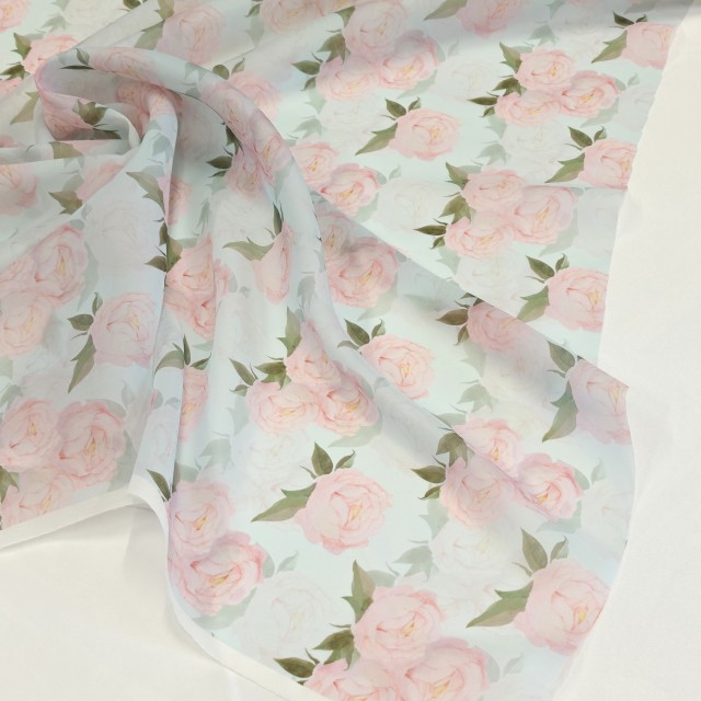 • Органза матовая Виола с пионами на голубом для пошива нарядных платьев.