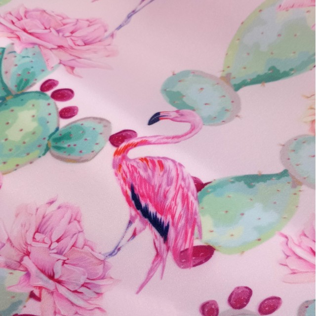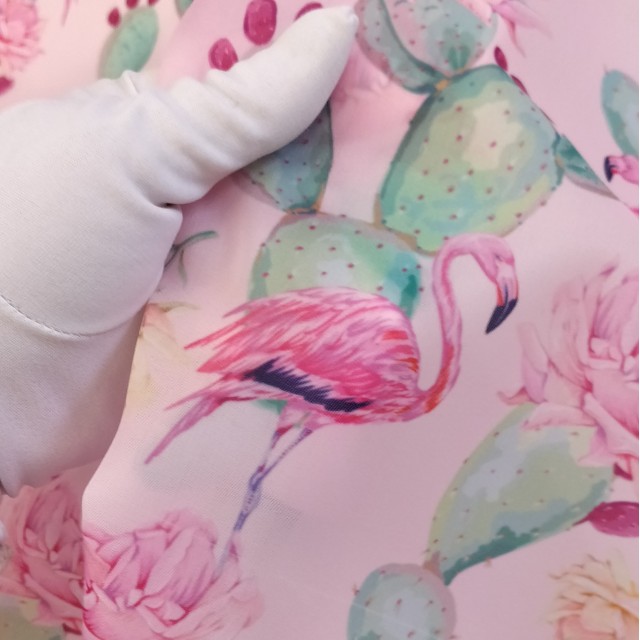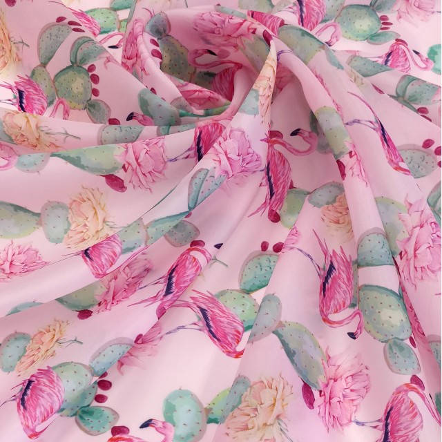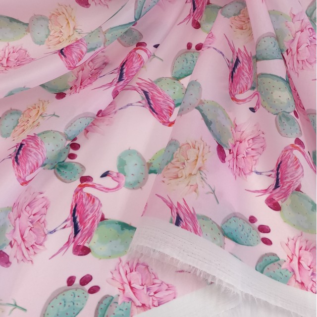 - Органза матовая Виола с красочным принтом розовый фламинго и цветущий кактус