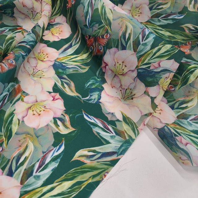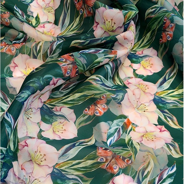 Ткань органза Виола с красивым тропическим принтом будет прекрасным вариантом для пошива модных нарядных платьев.