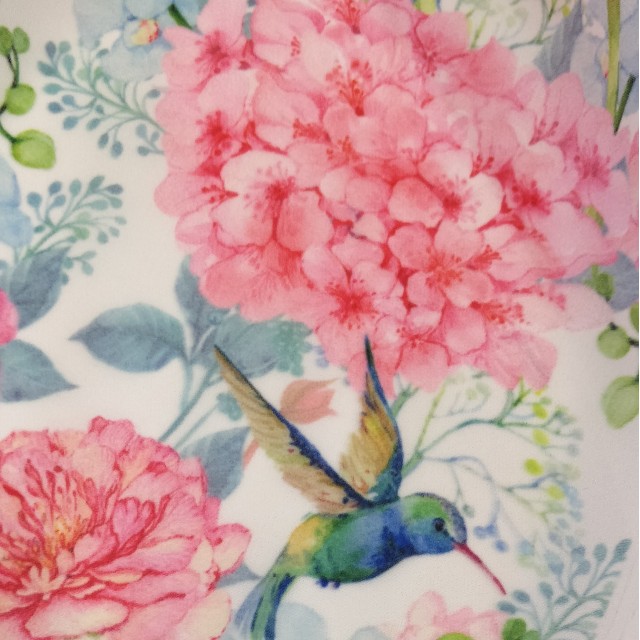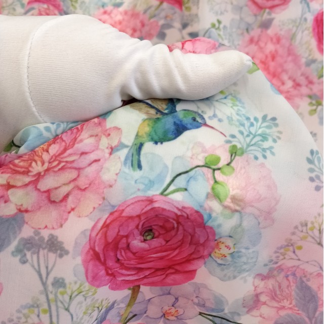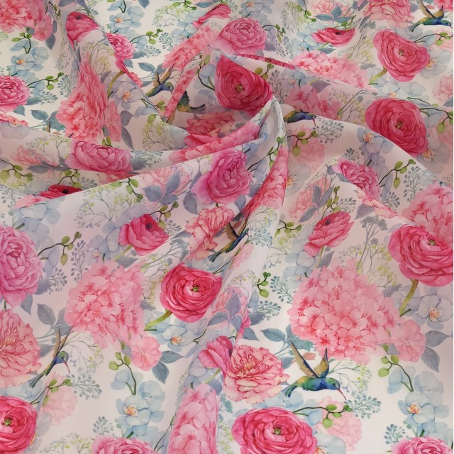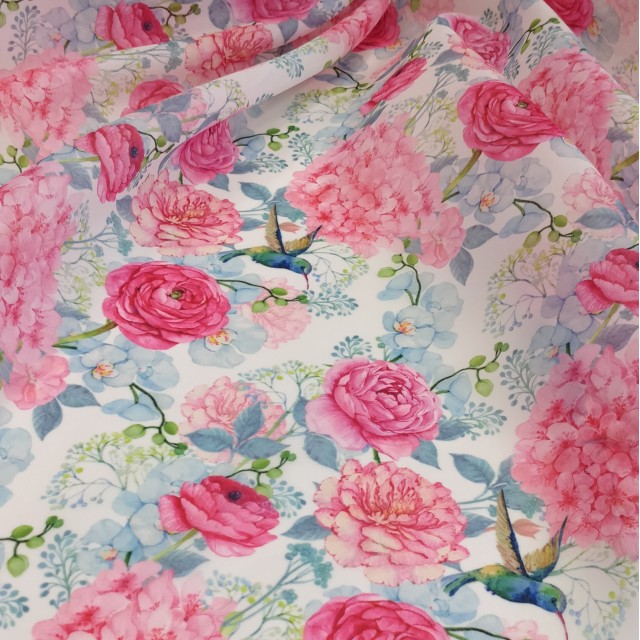 - Органза матовая Виола с цветочным принтом Ранункулюс и Колибри