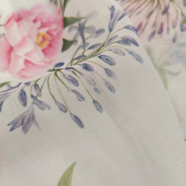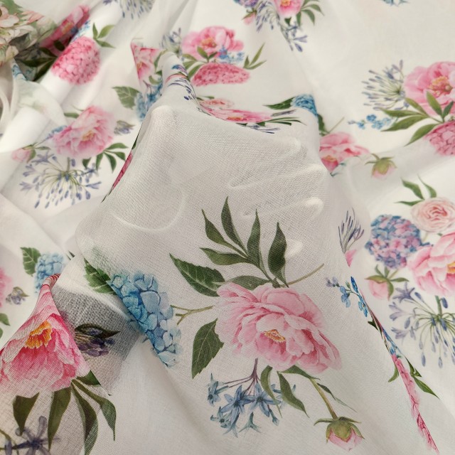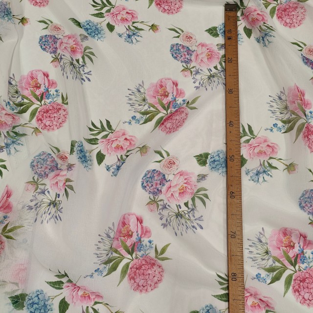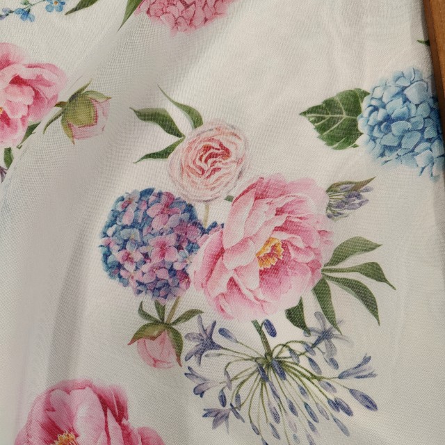 - Органза Тори матовая с розово голубой Гортензией для пошива нарядных платьев