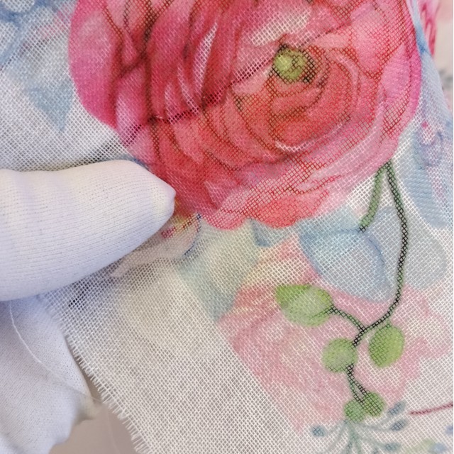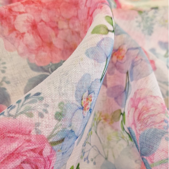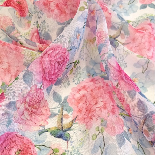- Органза Тори матовая с цветочным принтом Ранункулюс и Колибри для пошива нарядных платьев