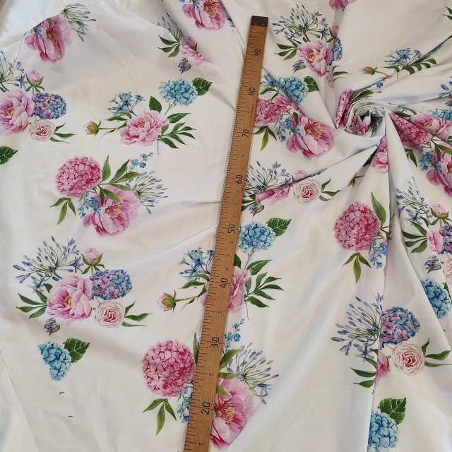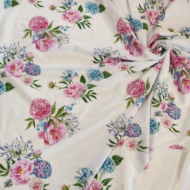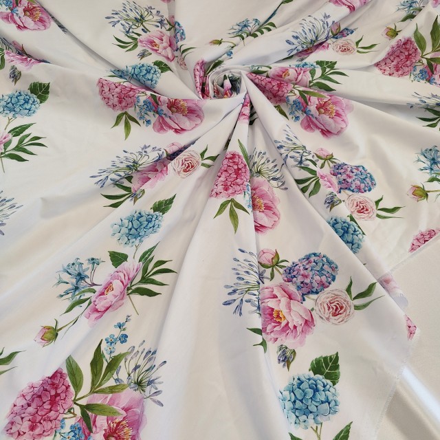 - Плательный поплин с принтом розово голубая гортензия для шитья нарядных платьев